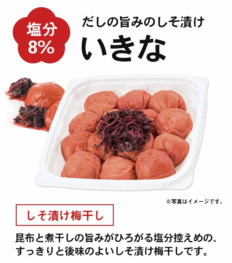 | 原材料名 | 梅、しそ、漬け原材料(還元水飴、食塩、しそ液、発酵調味料、醸造酢、煮干しエキス、こんぶエキス)/野菜色素、ビタミンB1 | ||